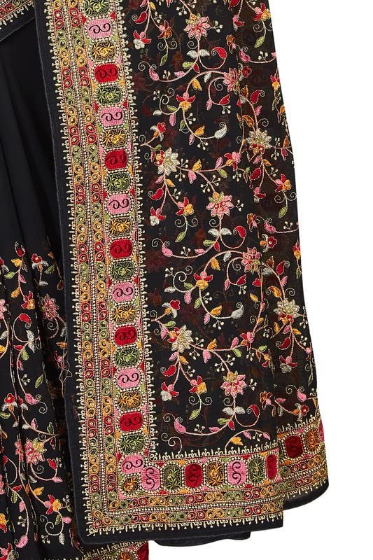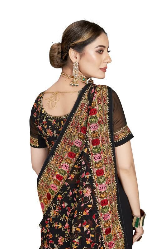 Black Kashmiri Resham Heavy Embroidered Border Work Georgette Saree Sari with Heavy Work UnStitch Blouse Piece For Women & Girls