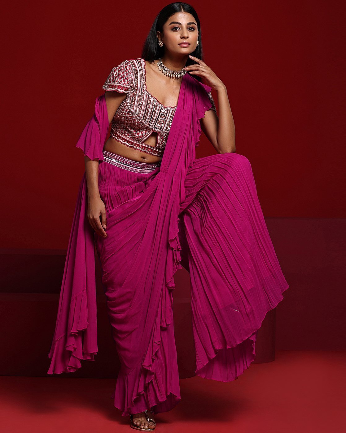 - The last image gives a detailed look of the blouse piece that comes with this saree (The model is wearing a blouse from our in-house wardrobe)